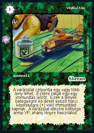 Szöveg: A varázslat célpontja egy vagy több lény lehet. Ezekre rakjál egy-egy immunitás jelzőt. Ezek a lények betegségre és direkt sebző harci képességre (+) való immunitást kapnak. A varázslat idézési költsége annyi VP, ahány lényre használod.