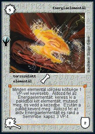Szöveg: Minden elementál idézési költsége 1 VP-vel kevesebb. Áldozd fel az Energiaelementált: keress ki a paklidból két elementált, mutasd meg, és vedd a kezedbe. Ezután a paklid keverd meg. Áldozd fel az aktív Energiaelementált és rakd a Semmibe: kapsz 3 VP-t.