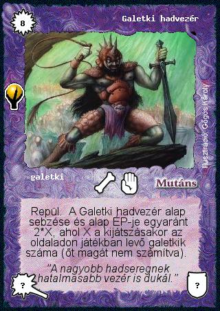 Szöveg: Repül. A Galetki hadvezér alap sebzése és alap ÉP-je egyaránt 2*X, ahol X a kijátszásakor az oldaladon játékban levő galetkik száma (őt magát nem számítva).