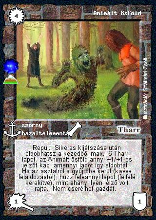 Szöveg: Repül. Sikeres kijátszása után eldobhatsz a kezedből max. 6 Tharr lapot, az Animált ősföld annyi +1/+1-es jelzőt kap, amennyi lapot így eldobtál. Ha az asztalról a gyűjtőbe kerül (kivéve feláldozástól), húzz feleannyi lapot (felfelé kerekítve), mint ahány ilyen jelző volt rajta. Nem cserélhet gazdát.