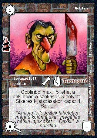 Kiadás: Rúvel hegy, Alappakli, 6. kiadás (Ősök Városa), Alappakli, 7. kiadás (Ősök Városa) Gyakoriság: gyakori Lapszín (isten): Tisztogató Klán Típus: torzszülött Altípus: goblin Szöveg: Goblinból max. 5 lehet a paklidban a szokásos 3 helyett. Sikeres kijátszásakor kapsz 1 Szk-t. Szinesítő szöveg: "Amióta felfedeztük hihetetlen méretű kolóniájukat, megállás nélkül irtjuk őket." - Dexkill, a pusztító Illusztráció: Tikos Péter Tervező: Balogh Attila Márton