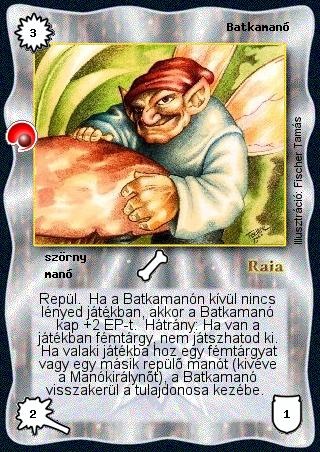 Szöveg: Repül. Ha a Batkamanón kívül nincs lényed játékban, akkor a Batkamanó kap +2 ÉP-t. Hátrány: Ha van a játékban fémtárgy, nem játszhatod ki. Ha valaki játékba hoz egy fémtárgyat vagy egy másik repülő manót (kivéve a Manókirálynőt), a Batkamanó visszakerül a tulajdonosa kezébe.