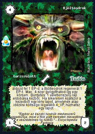 Szöveg: áldozd fel 1 ÉP-d: a Bjölteodrok regenerál 1 ÉP-t. Max. 4-szer gyógyíthatod így egy körben. Büntetés: 1 véletlenszerű lap eldobása kézből. Ha sikeresen kijátszol a kezedből egy lény lapot, amelynek alap idézési költsége legalább 4 VP, húzhatsz egy lapot.
