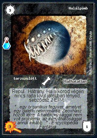 Kiadás: Esthar Császárság, Alappakli, 7. kiadás (Ősök Városa) Gyakoriság: gyakori Lapszín (isten): Halhatatlan Klán Típus: torzszülött Szöveg: Repül. Hátrány: Ha a köröd végén nincs rajta kívül játékban lényed, sebződsz 2 ÉP-t. Szinesítő szöveg: "...egy organikus fegyver, amelyet egy galetki nekromanta, Zeoxhasz hozott létre. A hatékonysággal nem volt probléma, az irányíthatósággal annál inkább..." - Encyclopédia Fantasia Illusztráció: Havancsák Gyula