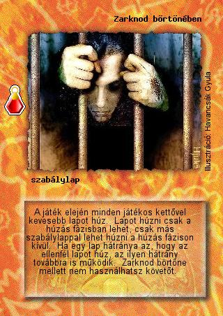Hatalom Kártyái kártyalap - Zarknod börtönében| (AK100) Húzhatok lapot Az áldozat szintjével Zarknod börtöne mellett. Minden olyan lappal húzhatsz, ami a húzási fázisban húz (pl. Rughar gépezete, Időgyorsító stb.). | | (AK100) Húzhatok lapot Zarknod börtöne mellett, ha az ellenfelem Az őrület fanatistáiból kapott jelzővel elpusztítja egy lapomat, mivel ekkor jelző hátránya miatt húzom a lapot, ezt pedig a börtön megengedi. | | (AK126) Minden szabály vagy változás, amit a Zarknod börtönéről korábban írtunk, érvényes a Zarknod bilincsére is. | | (AK89) Húzhatok lapot akkor, ha az ellenfelem Zarknod börtönében szabálylappal játszik, és Az őrület fanatistái jelzővel leszedi egy lapomat. A Zarknod börtönében szabálylap nem vonatkozik a hátrányokra. Ez a laphúzás pedig a fanatista jelző hátránya. | | (AK91) Én Építő Rakshallionnal játszok, míg ellenfelem Zarknod börtönével. Nem húzhatok lapot, ha két épületem van játékban. A Zarknod börtöne mellett sem helyszínnel, sem követővel, sem egyéb lapokkal nem lehet lapot húzni a húzás fázison kívül, csak szabálylappal. | | Zarknod börtönénél és bilincsénél a \"Ha egy lap hátránya...\" kitétel vonatkozik a jelzők hátrányára is. Lehet tehát lapot húzni mellettük az Élőholt kémekkel. | | Ha a Kreatív affinitást az ellenfélre játszom ki, és dobatok tőle, akkor ő húzhat egy lapot. Ez nem hátrány, hanem a lap képességének része, tehát pl. Zarknod börtöne mellett nem húzhat. | | Ha a Változó környezettel kezdésként Ősi rúnát kérek, az nem tudja letiltani azokat a szabálylapokat, amik a játék elején csinálnak valamit (pl. Zarknod börtönében, A bőség zavara, Lépéselőny stb.). A HKK Kódexben pontosan le lesz írva az idevonatkozó szabály, most idézzük a Kódex idevonatkozó részét: