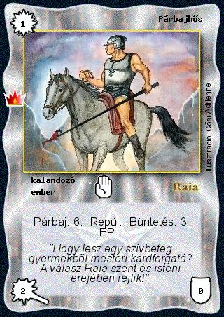 Kiadás: Ősi legendák, Alappakli, 8. kiadás Gyakoriság: ritka Lapszín (isten): Raia Típus: kalandozó Altípus: ember Szöveg: Párbaj: 6. Repül. Büntetés: 3 ÉP. Szinesítő szöveg: "Hogy lesz egy szívbeteg gyermekből mesteri kardforgató? A válasz Raia szent és isteni erejében rejlik!" Illusztráció: Gősi Adrienne