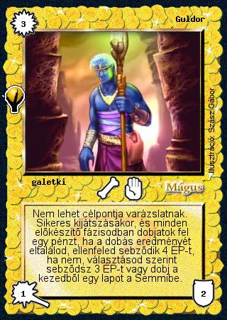 Kiadás: Alappakli, 6. kiadás (Ősök Városa), Alappakli, 7. kiadás (Ősök Városa) Gyakoriság: ritka Lapszín (isten): Mágus Klán Típus: galetki Szöveg: Nem lehet célpontja varázslatnak. Sikeres kijátszásakor, és minden előkészítő fázisodban dobjatok fel egy pénzt, ha a dobás eredményét eltalálod, ellenfeled sebződik 4 ÉP-t, ha nem, választásod szerint sebződsz 3 ÉP-t vagy dobj a kezedből egy lapot a Semmibe. Illusztráció: Szász Gábor