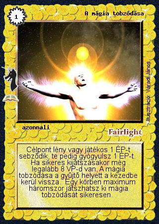 Szöveg: Célpont lény vagy játékos 1 ÉP-t sebződik, te pedig gyógyulsz 1 ÉP-t. Ha sikeres kijátszásakor még legalább 8 VP-d van, A mágia tobzódása a gyűjtő helyett a kezedbe kerül vissza. Egy körben maximum háromszor játszhatsz ki mágia tobzódását sikeresen.