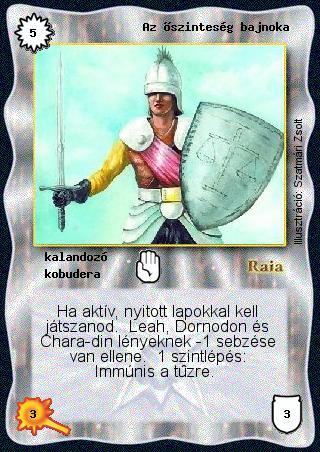 Szöveg: Ha aktív, nyitott lapokkal kell játszanod. Leah, Dornodon és Chara-din lényeknek -1 sebzése van ellene. 1 szintlépés: Immúnis a tűzre.