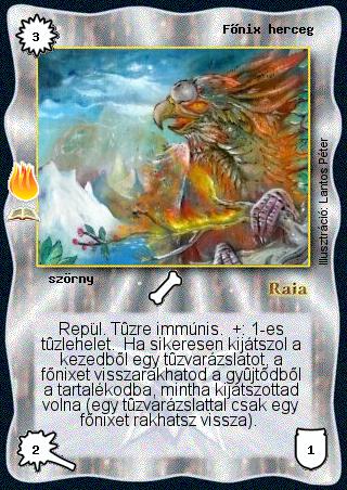 Szöveg: Repül. Tűzre immúnis. +: 1-es tűzlehelet. Ha sikeresen kijátszol a kezedből egy tűzvarázslatot, a főnixet visszarakhatod a gyűjtődből a tartalékodba, mintha kijátszottad volna (egy tűzvarázslattal csak egy főnixet rakhatsz vissza).