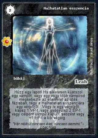 Kiadás: Rhatt fénykora Gyakoriság: ritka Lapszín (isten): Leah Típus: bűbáj Szöveg: Húzz egy lapot! Ha sikeresen kijátszol egy vámpírt, vagy egy vagy több vámpírod megsebezte az ellenfelet az ütés fázisban, tégy a Halhatatlan esszenciára egy vérjelzőt. Végy le egy vérjelzőt: kapsz 1 VP-t, vagy gyógyulsz 2 ÉP-t, vagy célpont vámpír kap +1 sebzést vagy +1 ÉP-t a kör végéig. Szinesítő szöveg: "Vér nélkül nincsen élet, nincsen semmi." - Loachlan Illusztráció: Váradi János