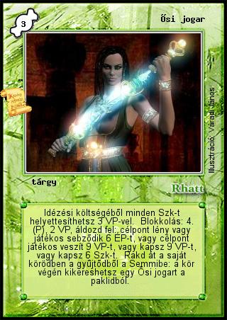 Szöveg: Idézési költségéből minden Szk-t helyettesíthetsz 3 VP-vel. Blokkolás: 4. (P), 2 VP, áldozd fel: célpont lény vagy játékos sebződik 6 ÉP-t, vagy célpont játékos veszít 9 VP-t, vagy kapsz 9 VP-t, vagy kapsz 6 Szk-t. Rakd át a saját körödben a gyűjtődből a Semmibe: a kör végén kikereshetsz egy Ősi jogart a paklidból.