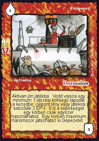 Szöveg: Aktívan jön játékba. Vedd vissza egy minimum 1 idézési költségű lapodat a kezedbe: célpont lény vagy játékos sebződik 2 ÉP-t. Ezt a képességet egy körben csak egyszer használhatod. Egy körben maximum háromszor játszhatsz ki Gépezetet.