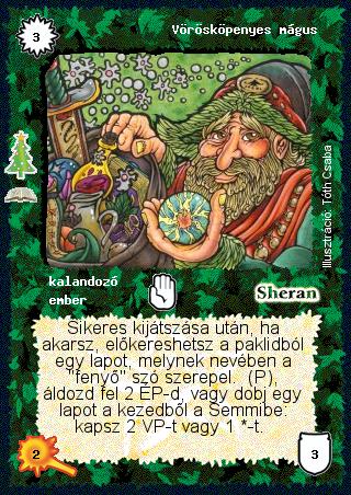 Szöveg: Sikeres kijátszása után, ha akarsz, előkereshetsz a paklidból egy lapot, melynek nevében a "fenyő" szó szerepel. (P), áldozd fel 2 ÉP-d, vagy dobj egy lapot a kezedből a Semmibe: kapsz 2 VP-t vagy 1 *-t.