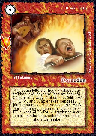 Szöveg: Kijátszási feltétele, hogy kiválaszd egy játékban levő lényed (ő lesz az énekes). Célpont lény vagy játékos sebződik X+2 ÉP-t, ahol X az énekes sebzése, játékosba max. 9-et sebezhetsz. Ha A vér dala a gyűjtődben van, áldozz fel 4 ÉP-t, költs el 2 VP-t: kijátszhatod A vér dalát, mintha a kezedben lenne, majd rakd a Semmibe.
