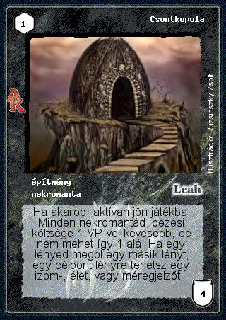 Kiadás: Alanori Krónika Gyakoriság: ritka Lapszín (isten): Leah Típus: építmény Altípus: nekromanta Szöveg: Ha akarod, aktívan jön játékba. Minden nekromantád idézési költsége 1 VP-vel kevesebb, de nem mehet így 1 alá. Ha egy lényed megöl egy másik lényt, egy célpont lényre tehetsz egy izom-, élet, vagy méregjelzőt. Illusztráció: Ruzsinszki Zsolt