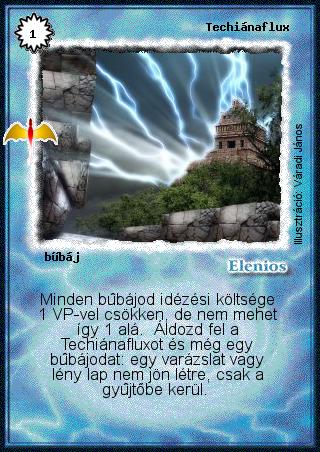 Szöveg: Minden bűbájod idézési költsége 1 VP-vel csökken, de nem mehet így 1 alá. Áldozd fel a Techiánafluxot és még egy bűbájodat: egy varázslat vagy lény lap nem jön létre, csak a gyűjtőbe kerül.