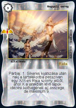 Szöveg: Párbaj: 1. Sikeres kijátszása után rakj a tartalékodba passzívan egy X/X-es Raia szörny jelzőt, ahol X a játékban lévő lapok idézési költségének az összege, de maximum 9.