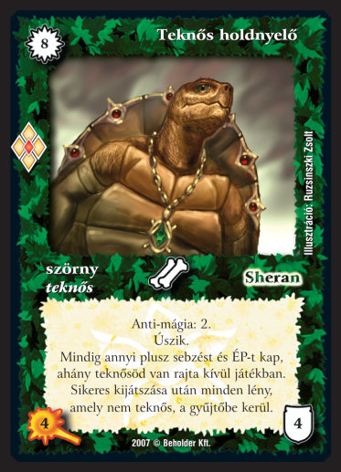 Kiadás: Misztikus Erők Gyakoriság: ritka Lapszín (isten): Sheran Típus: szörny Altípus: teknős Szöveg: Anti-mágia: 2. Úszik. Mindig annyi plusz sebzést és ÉP-t kap, ahány teknősöd van rajta kívül játékban. Sikeres kijátszása után minden lény, amely nem teknős, a gyűjtőbe kerül. Illusztráció: Ruzsinszki Zsolt