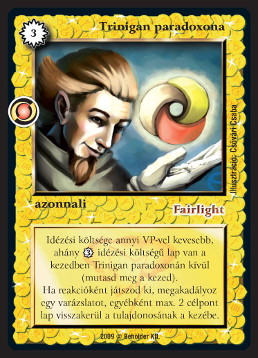 Szöveg: Idézési költsége annyi VP-vel kevesebb, ahány 3_VP idézési költségű lap van a kezedben Trinigan paradoxonán kívül (mutasd meg a kezed). Ha reakcióként játszod ki, megakadályoz egy varázslatot, egyébként max. 2 célpont lap visszakerül a tulajdonosának a kezébe.