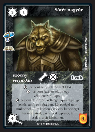 Szöveg: [Zén] 1_VP: célpont lény sebz?dik 3 ÉP-t. 1_VP: célpont játékos eldob egy véletlenszer? lapot. [X]: célpont X idézési költség? lapra tégy egy jelz?t, amíg ez rajta van, képességei nem m?ködnek. Egy körben csak egy képességét használhatod, azt is csak egyszer, és csak a saját körödben.