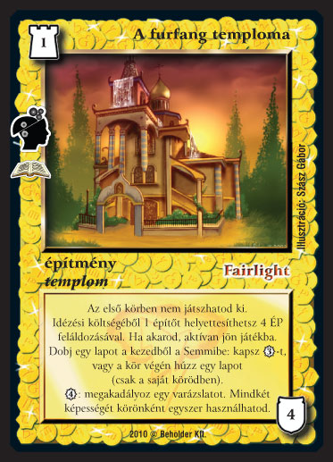 Kiadás: Emlékek (Zén) Gyakoriság: ritka Lapszín (isten): Fairlight Típus: építmény Altípus: templom Szöveg: Az els? körben nem játszhatod ki. Idézési költségéb?l 1 épít?t helyettesíthetsz 4 ÉP feláldozásával. Ha akarod, aktívan jön játékba. Dobj egy lapot a kezedb?l a Semmibe: kapsz 3_VP-t, vagy a kör végén húzz egy lapot (csak a saját körödben). 4_VP: megakadályoz egy varázslatot. Mindkét képességét körönként egyszer használhatod. Illusztráció: Szász Gábor