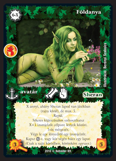 Kiadás: Örökkévalóság Gyakoriság: ritka Lapszín (isten): Sheran Típus: avatár Szöveg: X annyi, ahány Sheran lapod van játékban (rajta kívül), de max. 5. Repül. Sikeres kijátszásakor szétoszthatsz X+1 izomjelz?t. 5-ös mérgezés. Végy le egy lényedr?l egy izomjelz?t: Kapsz 2_VP-t, vagy kör végén húzz egy lapot. (Csak a saját körödben, körönként egyszer.) Illusztráció: Berényi Szabolcs