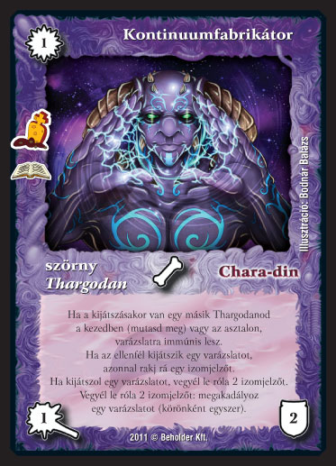 Szöveg: Ha a kijátszásakor van egy másik Thargodanod a kezedben (mutasd meg) vagy az asztalon, varázslatra immúnis lesz. Ha az ellenfél kijátszik egy varázslatot, azonnal rakj rá egy izomjelz?t. Ha kijátszol egy varázslatot, vegyél le róla 2 izomjelz?t. Vegyél le róla 2 izomjelz?t: megakadályoz egy varázslatot (körönként egyszer).