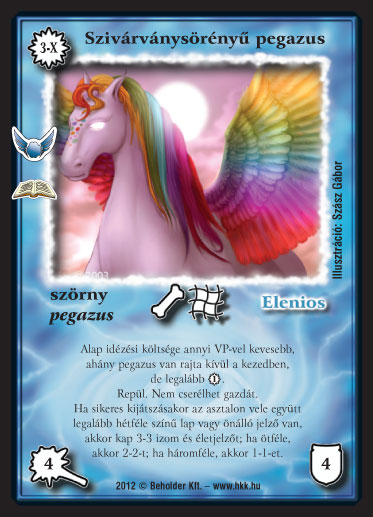 Kiadás: Felhők szárnyán (Zén) Gyakoriság: ritka Lapszín (isten): Elenios Típus: szörny Altípus: pegazus Szöveg: Alap idézési költsége annyi VP-vel kevesebb, ahány pegazus van rajta kívül a kezedben, de legalább 1_VP. Repül. Nem cserélhet gazdát. Ha sikeres kijátszásakor az asztalon vele együtt legalább hétféle szín? lap vagy önálló jelz? van, akkor kap 3-3 izom és életjelz?t; ha csak ötféle, akkor 2-2-t; ha legalább háromféle, akkor 1-1-et. Illusztráció: Szász Gábor