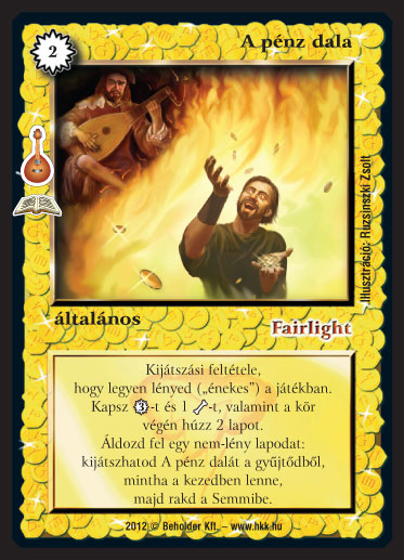 Szöveg: Kijátszási feltétele, hogy legyen lényed ("énekes") a játékban. Kapsz 3_VP-t és 1 _*-t, valamint a kör végén húzz 2 lapot. Áldozd fel egy nem-lény lapodat: kijátszhatod A pénz dalát a gy?jt?db?l, mintha a kezedben lenne, majd rakd a Semmibe.