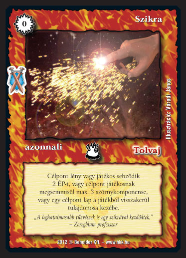Kiadás: Istenek viadala Gyakoriság: gyakori Lapszín (isten): Tolvaj Klán Típus: azonnali Szöveg: Célpont lény vagy játékos sebződik 2 ÉP-t, vagy célpont játékosnak megsemmisül max. 3 szörnykomponense, vagy egy célpont lap a játékból visszakerül tulajdonosa kezébe. Szinesítő szöveg: "A leghatalmasabb tűzvészek is egy szikrával kezdődtek." - Zoregblum professzor Illusztráció: Váradi János