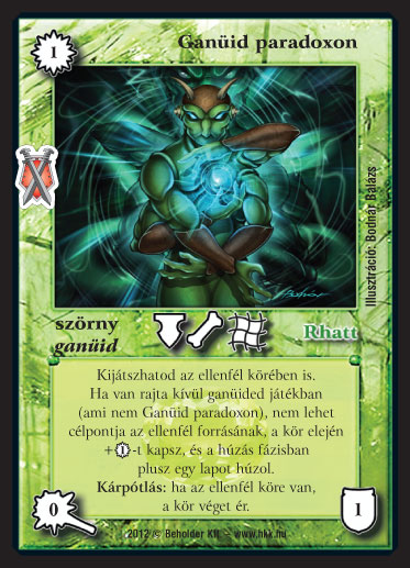 Szöveg: Kijátszhatod az ellenfél körében is. Ha van rajta kívül ganüided játékban (ami nem Ganüid paradoxon), nem lehet célpontja az ellenfél forrásának, a kör elején +1_VP-t kapsz, és a húzás fázisban plusz egy lapot húzol. Kárpótlás: ha az ellenfél köre van, a kör véget ér.