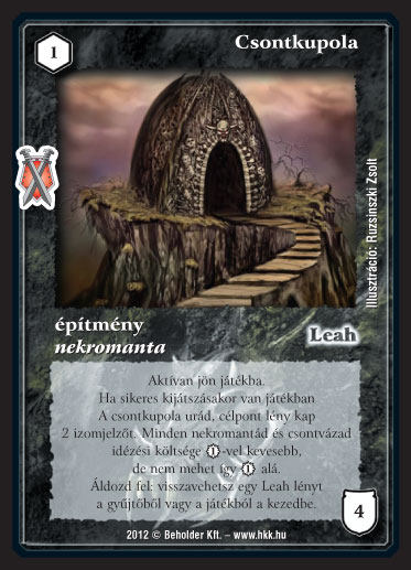 Szöveg: Aktívan jön játékba. Ha sikeres kijátszásakor van játékban A csontkupola urád, célpont lény kap 2 izomjelzőt. Minden nekromantád és csontvázad idézési költsége 1_VP-vel kevesebb, de nem mehet így 1_VP alá. Áldozd fel: visszavehetsz egy Leah lényt a gyűjtőből vagy a játékból a kezedbe.