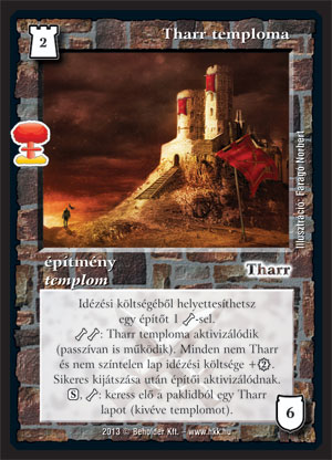 Szöveg: Idézési költségéből helyettesíthetsz egy építőt 1 _*-sel. _*_*: Tharr temploma aktivizálódik (passzívan is működik). Minden nem Tharr és nem színtelen lap idézési költsége +2_VP. Sikeres kijátszása után építői aktivizálódnak. (S), _*: keress elő a paklidból egy Tharr lapot (kivéve templomot).