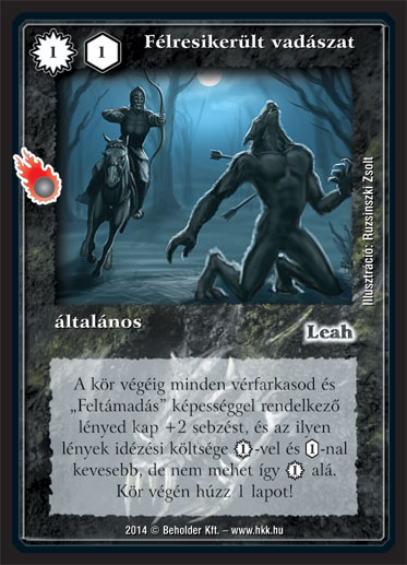 Szöveg: A kör végéig minden vérfarkasod és 'Feltámadás' képességgel rendelkező lényed kap +2 sebzést, és az ilyen lények idézési költsége 1_VP-vel és [1]-nal kevesebb, de nem mehet így 1_VP alá. Kör végén húzz 1 lapot!