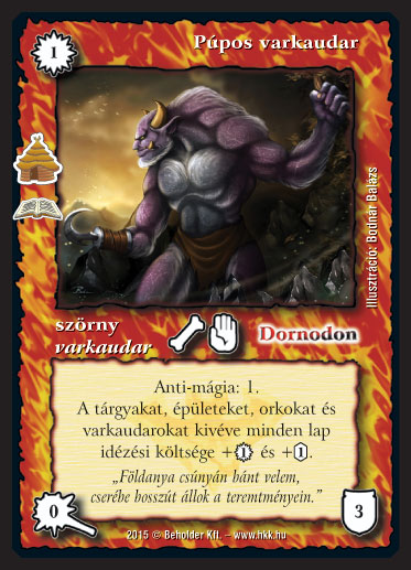 Szöveg: Anti-mágia: 1. A tárgyakat, épületeket, orkokat és varkaudarokat kivéve minden lap idézési költsége +1_VP és +[1].