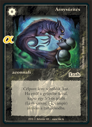 Szöveg: Célpont lény sebződik 3-at. Ha ettől a gyűjtőbe kerül, kapsz egy 5/5-ös jelzőt (Leah, szörny, _élőholt, vámpír) aktívan a tartalékodba.