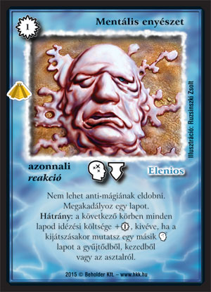 Szöveg: Nem lehet anti-mágiának eldobni. Megakadályoz egy lapot. Hátrány: a következő körben minden lapod idézési költsége +1_VP, kivéve, ha a kijátszásakor mutatsz egy másik _mentális lapot a gyűjtődből, kezedből vagy az asztalról.