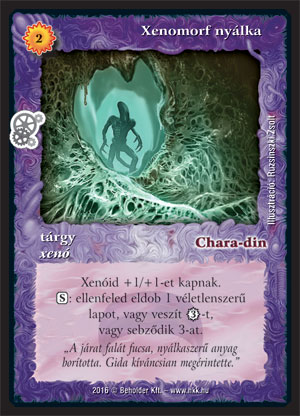 Szöveg: Xenóid +1/+1-et kapnak. (S): ellenfeled eldob 1 véletlenszerű lapot, vagy veszít 3_VP-t, vagy sebződik 3-at.