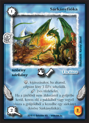 Szöveg: _etnikum, kijátszásakor, ha akarod, célpont lény 3 ÉP-t sebződik. _+: 2-es tűzlehelet. Ha a játékból nem áldozástól a gyűjtőbe kerül, keress elő a paklidból vagy vegyél vissza a gyűjtődből a kezedbe egy sárkányt (kivéve Sárkányfiókát).