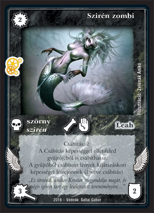 Kiadás: Védnök 2021, Kreátor műhelye Gyakoriság: ritka Lapszín (isten): Leah Típus: szörny Altípus: szirén Szöveg: Csábítás: 2. A Csábítás képességgel ellenfeled gyűjtőjéből is csábíthatsz. A gyűjtőből csábított lények kijátszáskori képességei létrejönnek (kivéve csábítás). Szinesítő szöveg: "Ez történik, amikor Kreátor meggondolja magát, és mégis igényt tart egy leselejtezett teremtményére...." Illusztráció: Zelenák Anikó