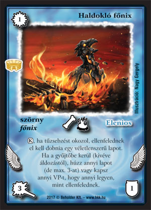 Kiadás: Alanori Olimpia Gyakoriság: ritka Lapszín (isten): Elenios Típus: szörny Altípus: főnix Szöveg: (K), ha tűzsebzést okozol, ellenfelednek el kell dobnia egy véletlenszerű lapot. Ha a gyűjtőbe kerül (kivéve áldozástól), húzz annyi lapot (de max. 3-at) vagy kapsz annyi VP-t, hogy annyi legyen, mint ellenfelednek. Illusztráció: Nagy Gergely