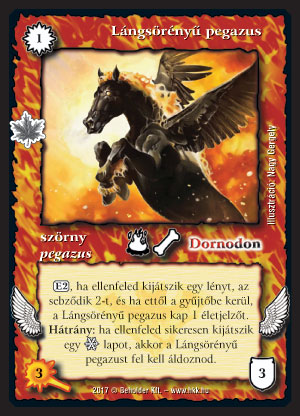 Szöveg: (E2), ha ellenfeled kijátszik egy lényt, az sebződik 2-t, és ha ettől a gyűjtőbe kerül, a Lángsörényű pegazus kap 1 életjelzőt. Hátrány: ha ellenfeled sikeresen kijátszik egy _hideg lapot, akkor a Lángsörényű pegazust fel kell áldoznod.
