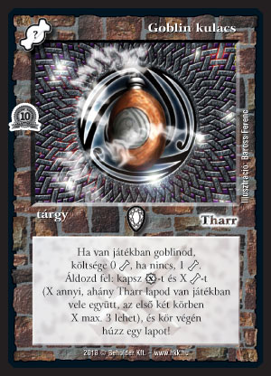 Szöveg: Ha van játékban goblinod, költsége 0 _*, ha nincs, 1 _*. Áldozd fel: kapsz X_VP-t és X _*-t (X annyi, ahány Tharr lapod van játékban vele együtt, az első két körben X max. 3 lehet), és kör végén húzz egy lapot!