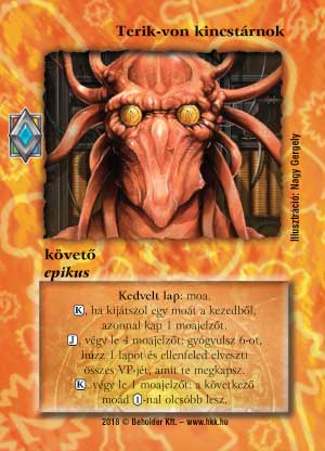 Szöveg: Kedvelt lap: moa. (K), ha kijátszol egy moát a kezedből, azonnal kap 1 moajelzőt. (J), végy le 4 moajelzőt: gyógyulsz 6-ot, húzz 1 lapot és ellenfeled elveszti összes VP-jét, amit te megkapsz. (K), végy le 1 moajelzőt: a következő moád [1]-nal olcsóbb lesz.