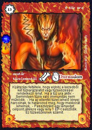 Kiadás: A tűz síkja (Invázió) Gyakoriság: ritka Lapszín (isten): Dornodon Típus: avatár Altípus: tűzelementál Szöveg: Kijátszási feltétele, hogy eldobj a kezedből két tűzvarázslatot vagy tűzsebzéssel rendelkező lényt. Ha a tűz ura aktív: - Semmilyen tűzre való immunitás nem működik. - Ha az ellenfél tüzet lehelő lényei harcolnak, te határozod meg, hogy mekkorát lehelnek. - Passzivizáld egy lényedet: célpont játékos vagy lény 1 ÉP-t sebződik. Ez tűzsebzésnek számít. Illusztráció: Gőgös Károly