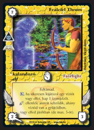 Szöveg: Feltámad. (K), ha sikeresen kijátszol egy víziót vagy elfet, kap 1 izomjelzőt. _+: ellenfele annyit sebződik (de max. 5-öt), ahány víziód van a gyűjtődben, vagy elfed játékban.