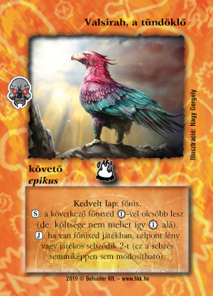 Szöveg: Kedvelt lap: főnix. (S): a következő főnixed 1_VP-vel olcsóbb lesz (de költsége nem mehet így 1_VP alá). (J): ha van főnixed játékban, célpont lény vagy játékos sebződik 2-t (ez a sebzés semmiképpen sem módosítható).