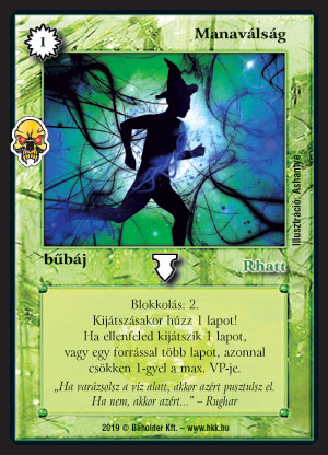 Szöveg: Blokkolás: 2. Kijátszásakor húzz 1 lapot! Ha ellenfeled kijátszik 1 lapot, vagy egy forrással több lapot, azonnal csökken 1-gyel a max. VP-je.