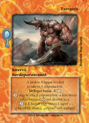 Kiadás: Tükördimenzió, Védnök 2023 Gyakoriság: nem gyakori Lapszín (isten): Színtelen Típus: követő Altípus: hordaparancsnok Szöveg: A játékot 4 lappal kezded és rakj rá 3 célpontjelzőt. Időleges hatás, 3: _háló (S), végy le róla 1 célpontjelzőt: a következő célzó forrásod 1_VP-vel olcsóbb lesz. (J): a 3. körtől végy vissza 1 lapot a gyűjtődből, amin a "célpont" szó szerepel. Illusztráció: Nagy Gergely